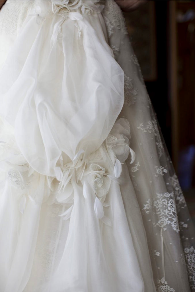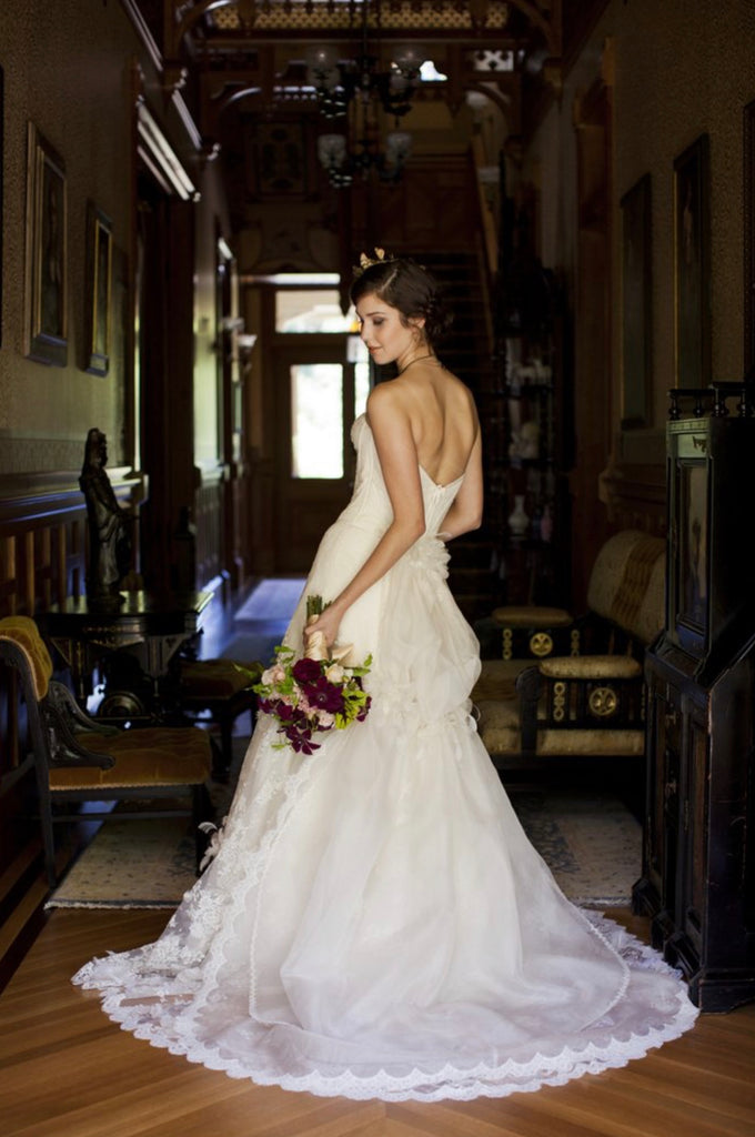 The Catherine gown features a classic channel boned sweetheart dropped waist bodice. The skirt is gently fitted through the body to the hip, then flaring to a dramatic trumpet with a Victorian bustle and a cathedral train. The gown is delicately detailed with our finest French Chantilly lace. Hand made silk,lace and feather flowers accented with crystal rhinestones adorn the back waist, bustle and the lower hem of the skirt. The base gown is 100% silk organza over 100% silk duchesse satin from Italy, lined and petticoat in 100% silk taffeta. The double layer bustle back train of 100% silk mesh and 100% silk organza is accented with French Chantilly lace trims and hand built lace flowers give a lovely ethereal quality.