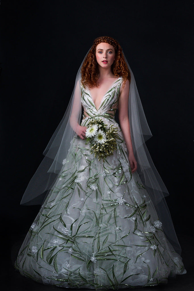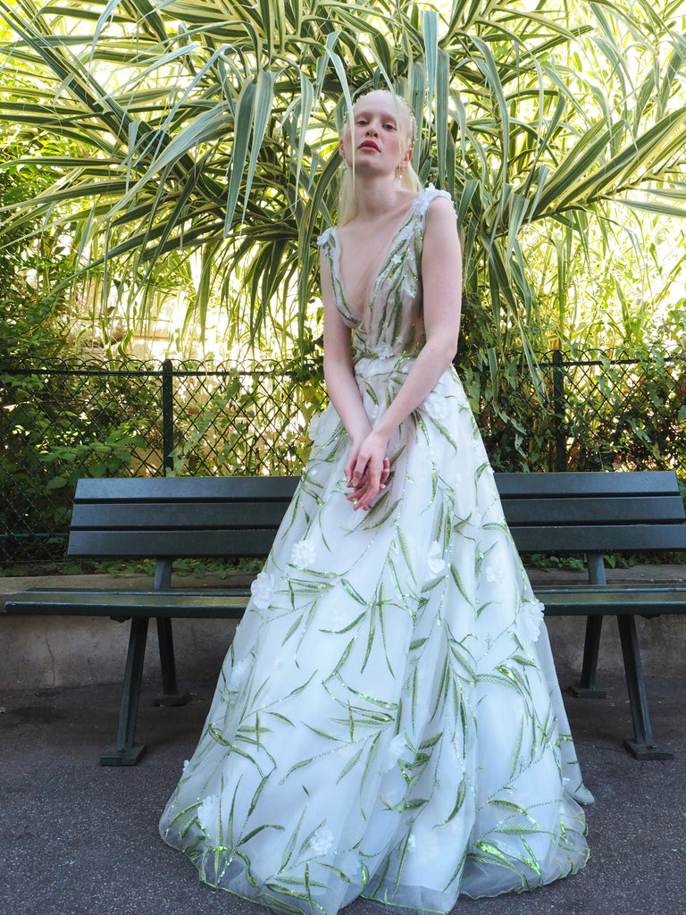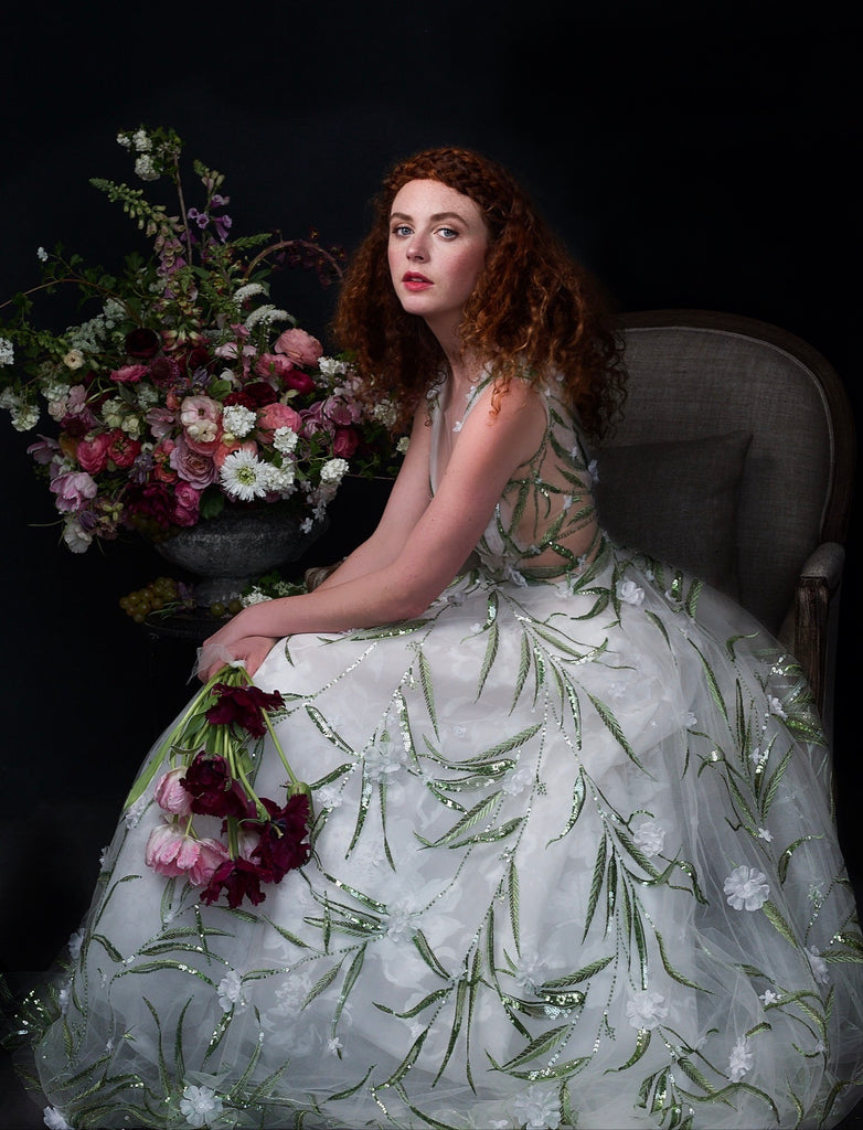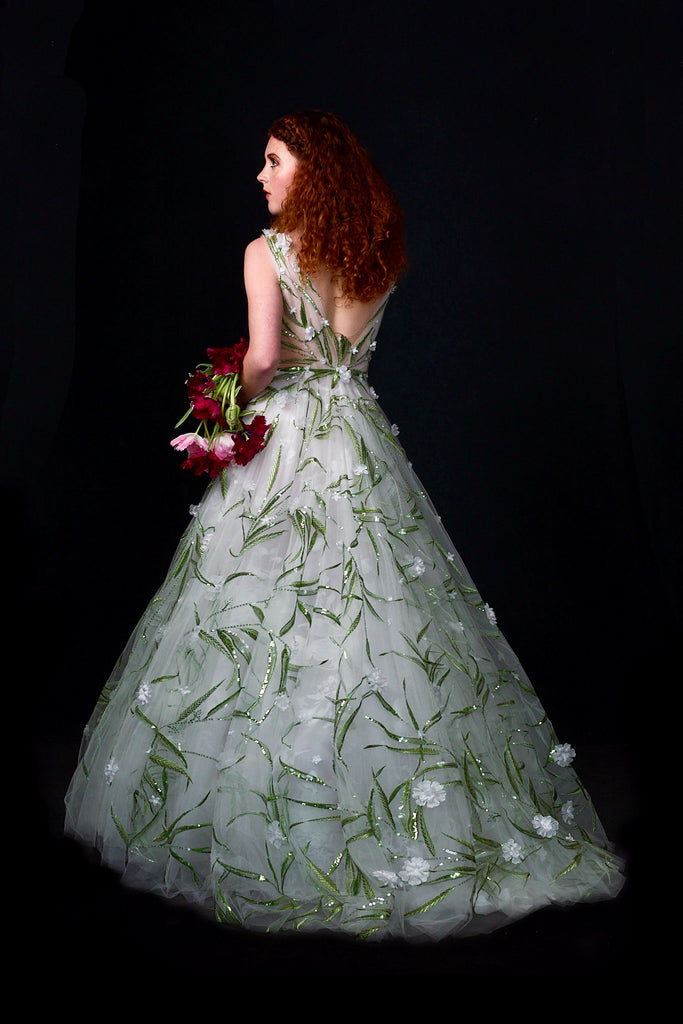 The Claire Gown is a lightweight ball gown with a small sweep train. Plunging V-neck bodice with front lining and invisible mesh cutout sides and back with an all over applique of sequined leaves. Italian embroidered tulle over hand painted 100% silk organza. Silk organza and tulle petticoat gives lightweight fullness to the skirt and the whole gown is accented with handmade silk organza flowers and crystals.