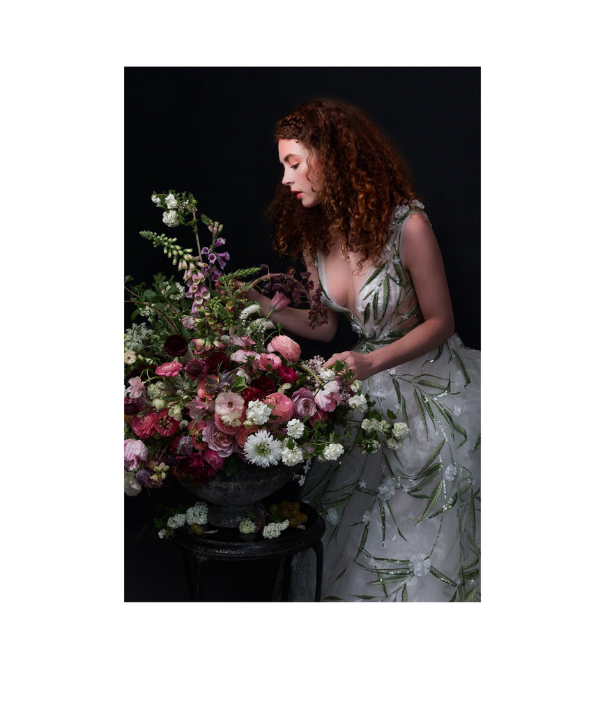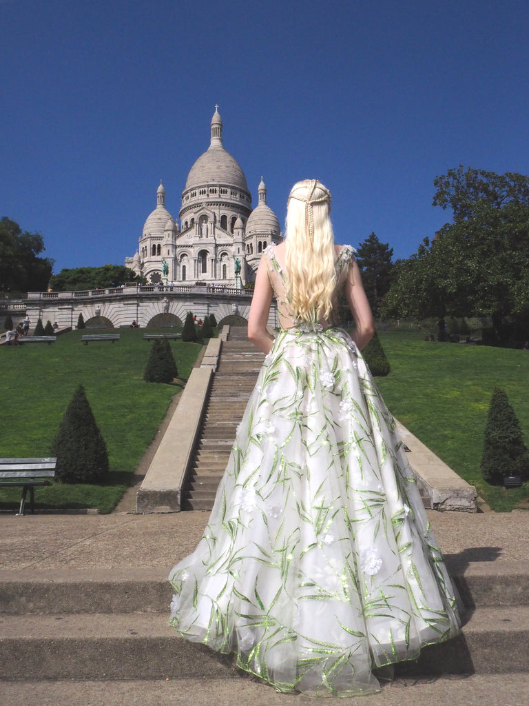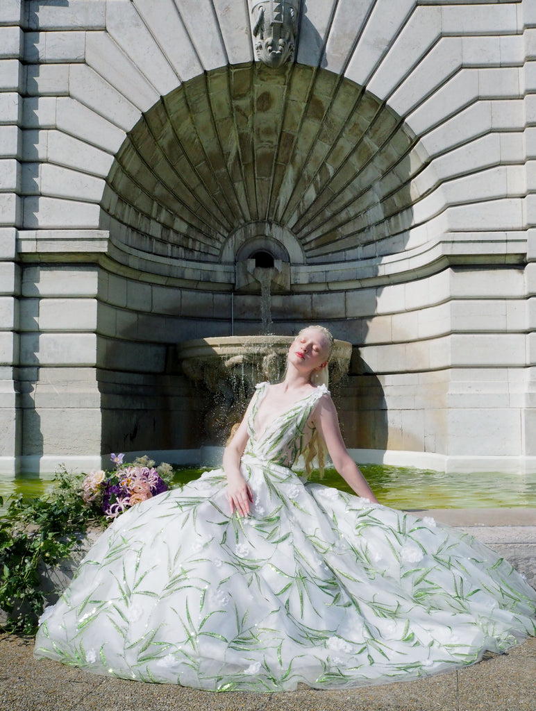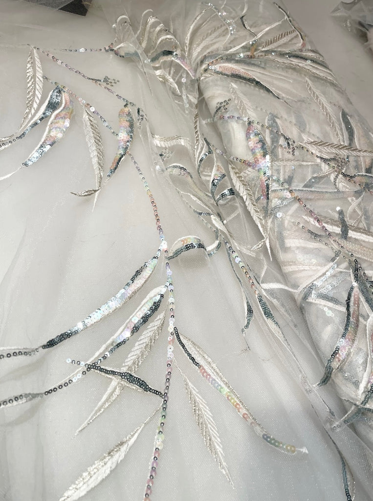 The Claire Gown is a lightweight ball gown with a small sweep train. Plunging V-neck bodice with front lining and invisible mesh cutout sides and back with an all over applique of sequined leaves. Italian embroidered tulle over hand painted 100% silk organza. Silk organza and tulle petticoat gives lightweight fullness to the skirt and the whole gown is accented with handmade silk organza flowers and crystals.