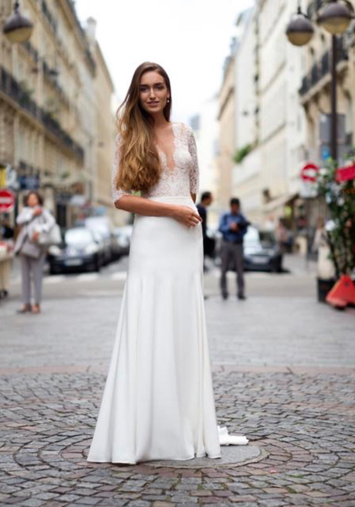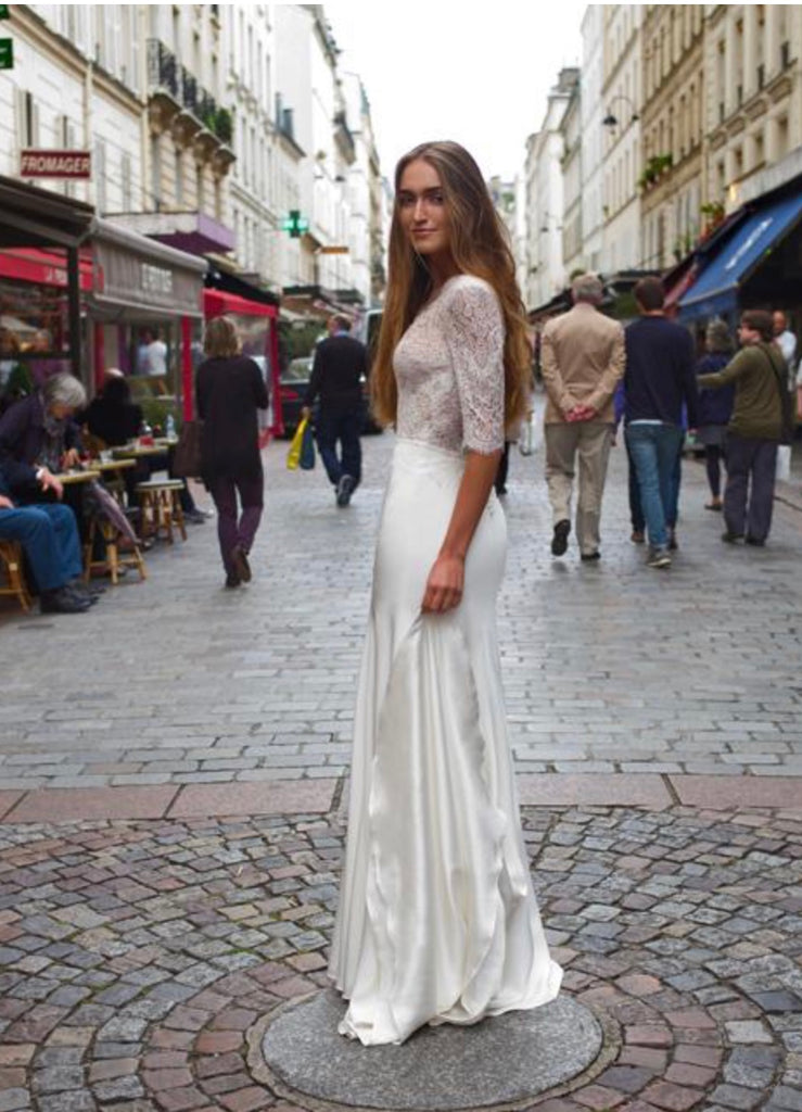 Deep V-neck French lace appliqué bodice with sheer illusion mesh, elbow length sleeves and silk covered buttons on the back zipper. Fitted skirt with a trumpet flare and a chapel length train. Made in a 6 ply 100% silk crepe for Italy, lined in 100%silk charmeuse. Waist is accented by a 3/8” wide lace belt with pale ivory glass seed beads.