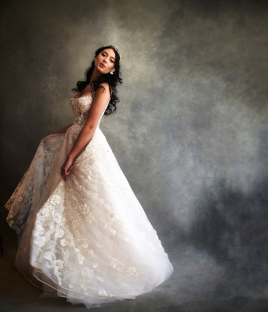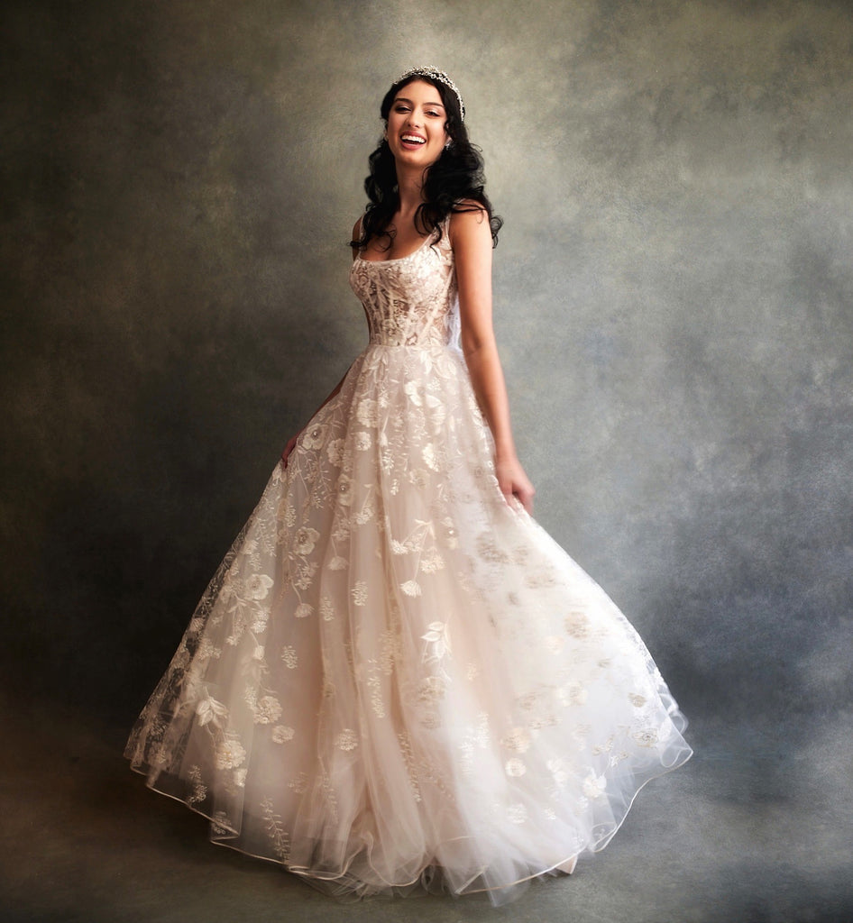 The Lulu Gown has a classic ballet neckline with a semi-sheer corset bodice, covered with floral appliquéd embroidery, accented with crystal rhinestones.