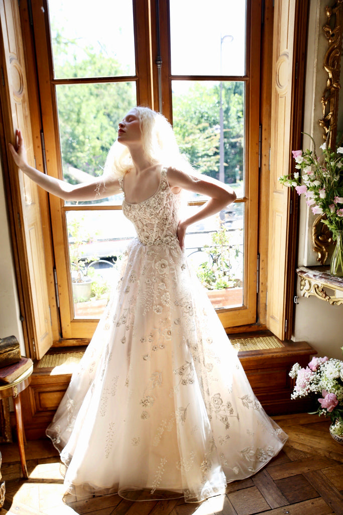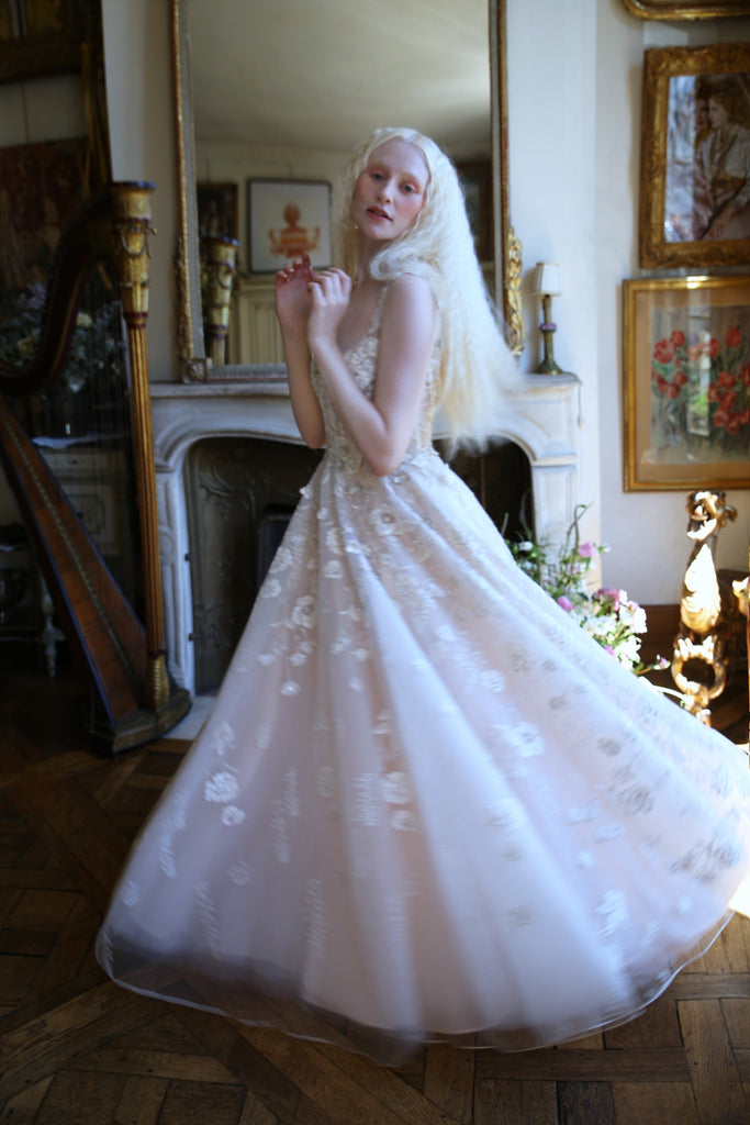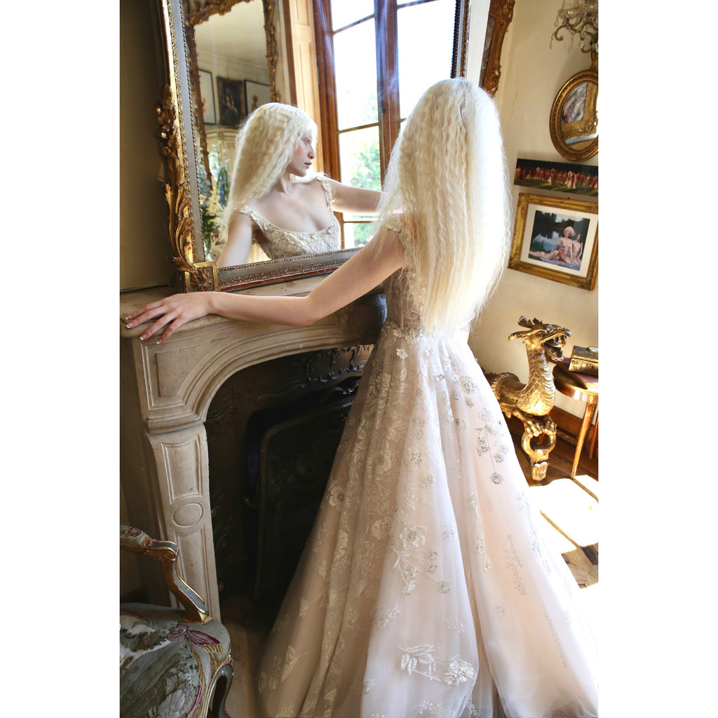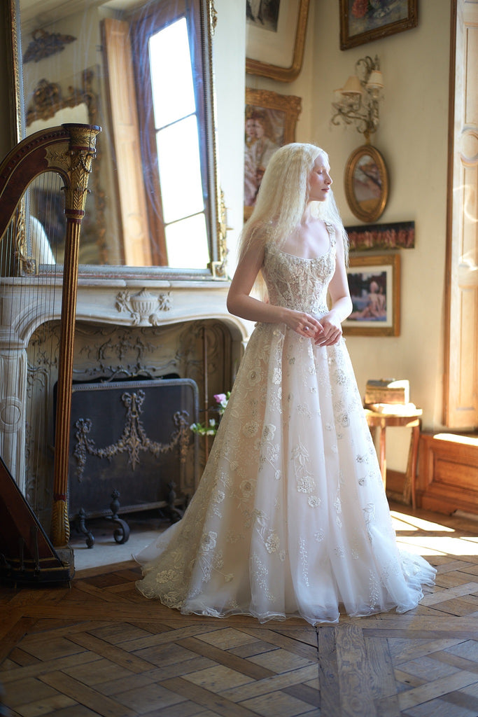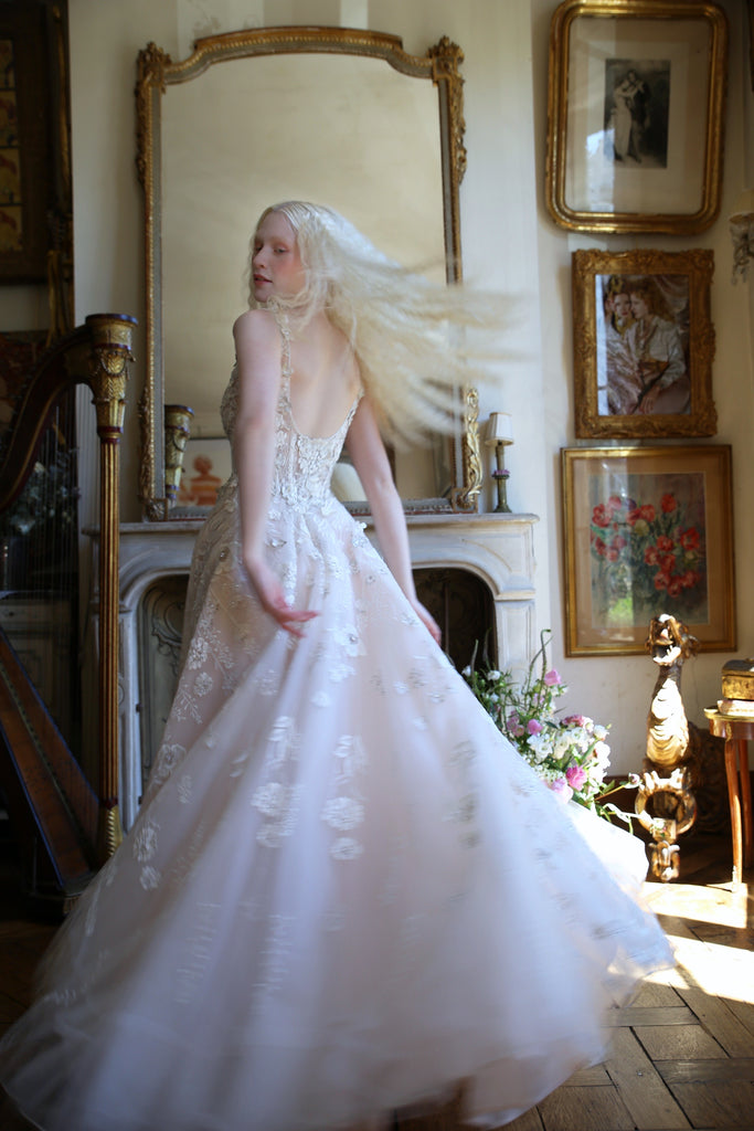 The full ballgown skirt is a highlighted with beautiful floral embroidered tulle over layers of tulle and silk organza that build soft sheer volume over a silk organza petticoat.