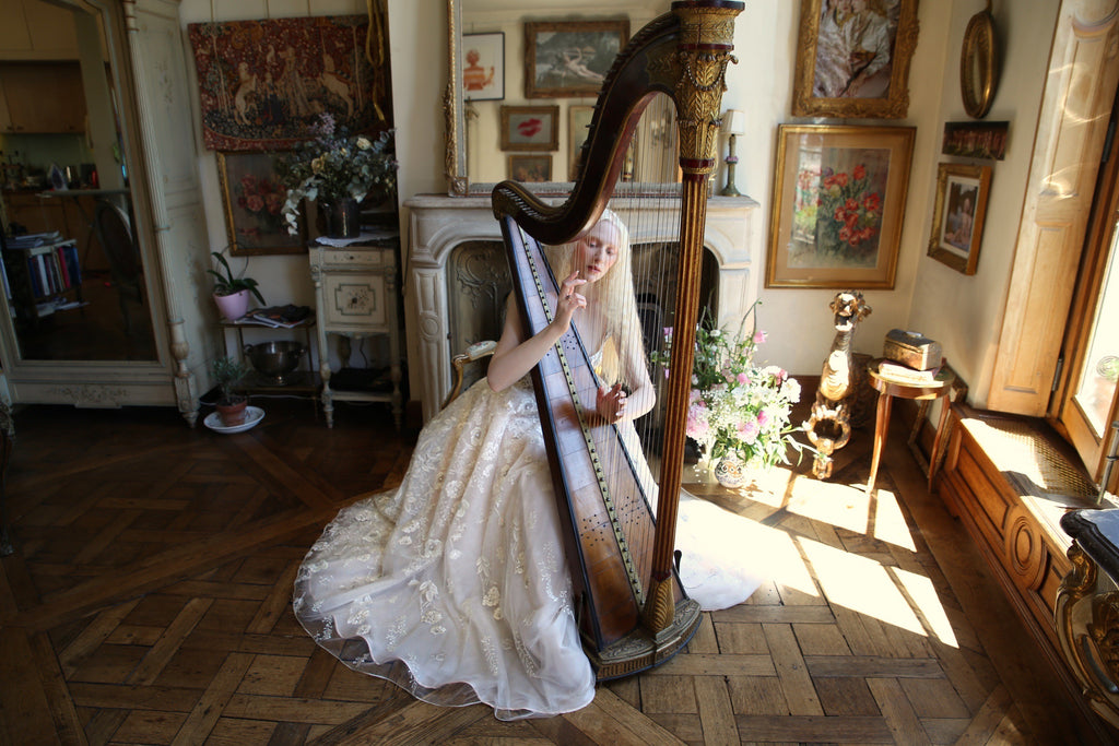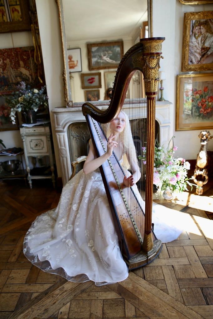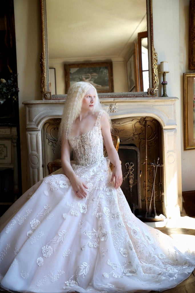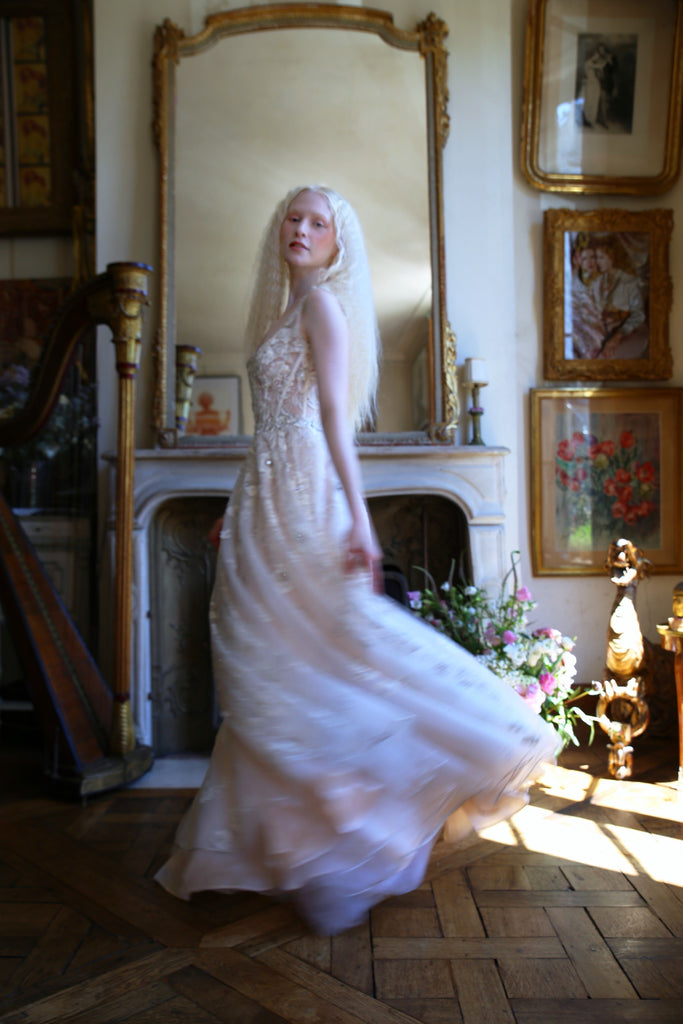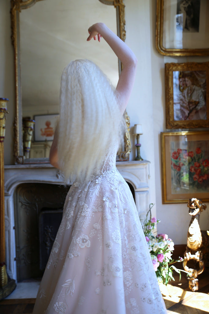 The full ballgown skirt is a highlighted with beautiful floral embroidered tulle over layers of tulle and silk organza that build soft sheer volume over a silk organza petticoat.