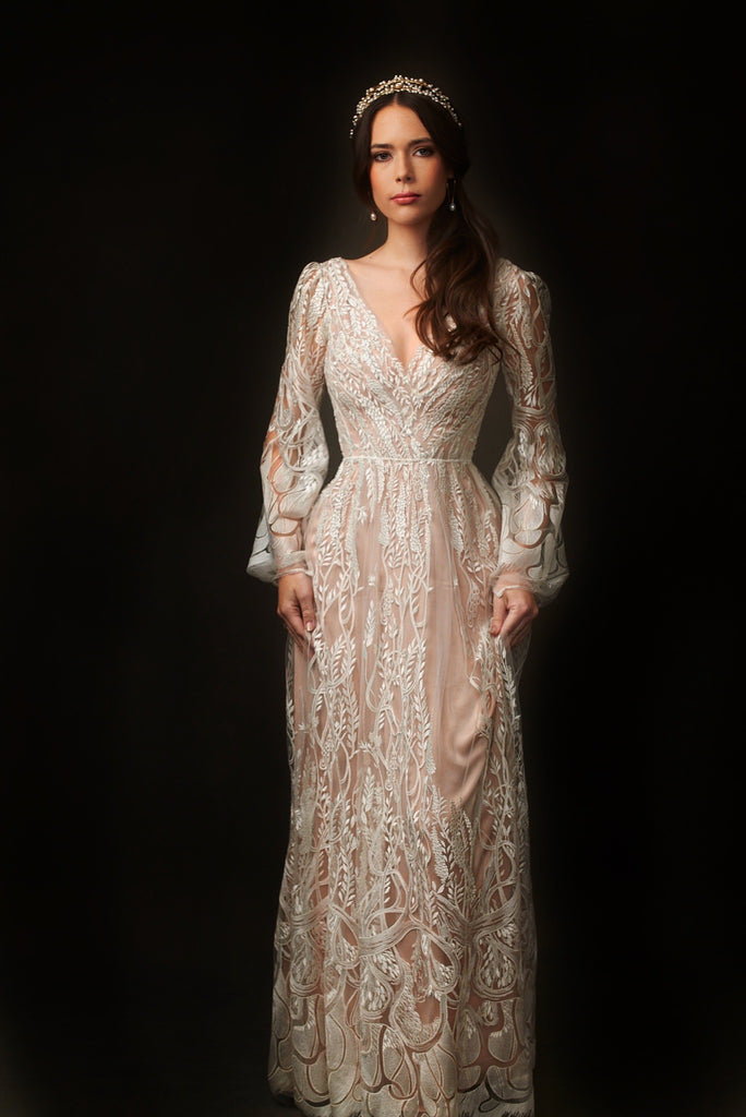 V- neck blouson sleeve gown of intricately hand appliquéd Italian embroidered tulle, lined in blush/nude 100% silk charmeuse. An exquisite haute couture embroidery based on an Arte Nouveau rendition of Wisteria.