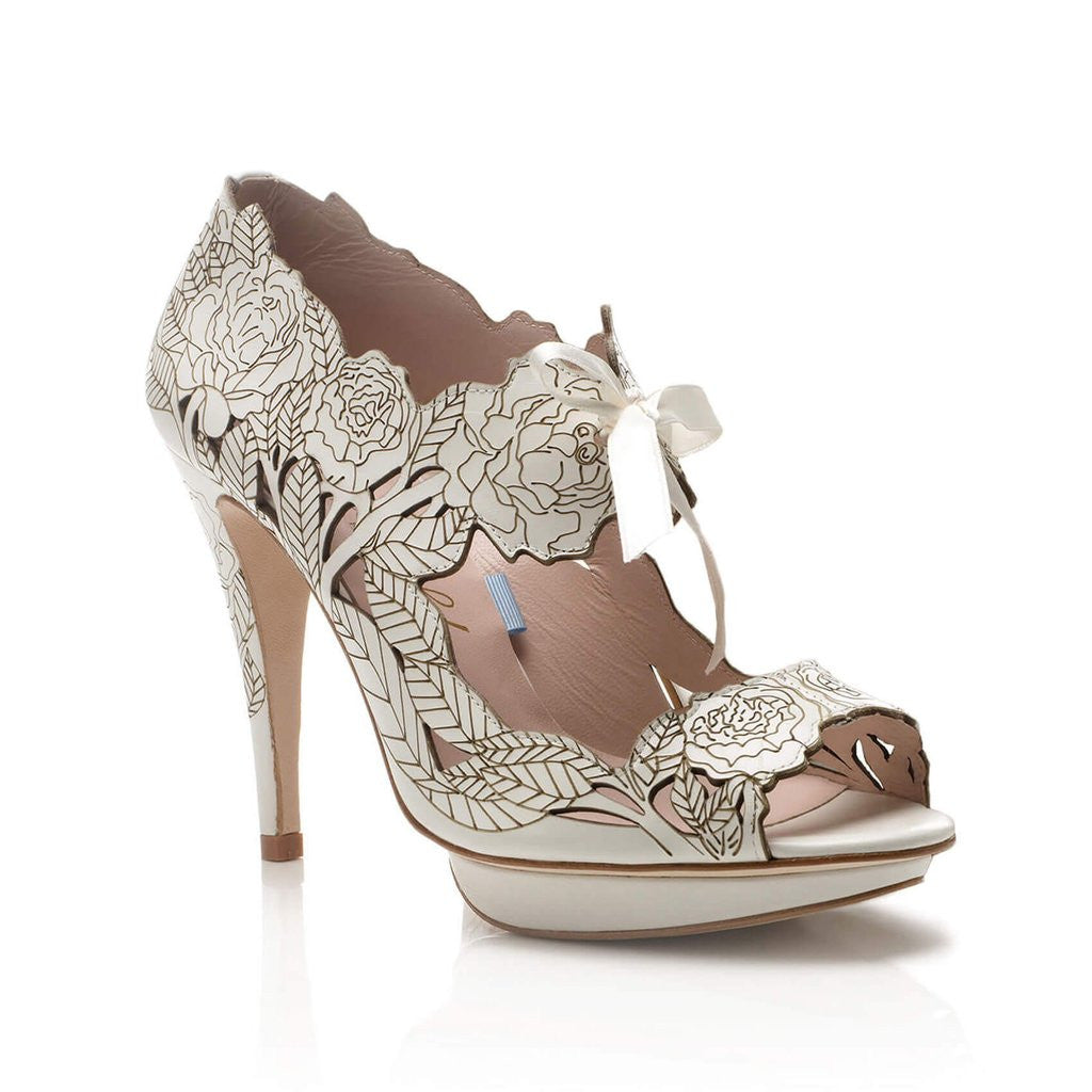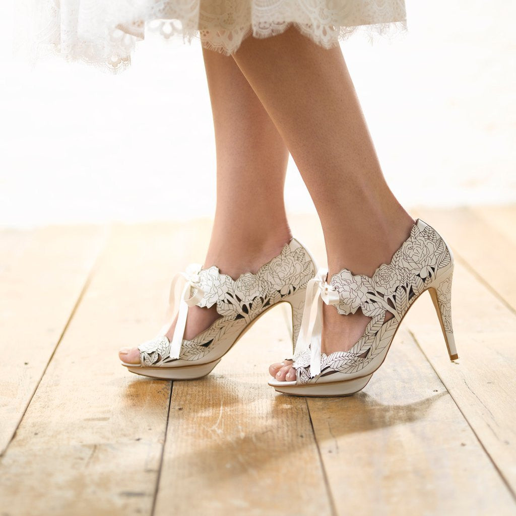 A high heel platform sandal with leather that has been crafted with an intricate floral laser design. Made in Spain, the style fastens neatly on the foot and comes with both a silk ribbon and a leather lace.